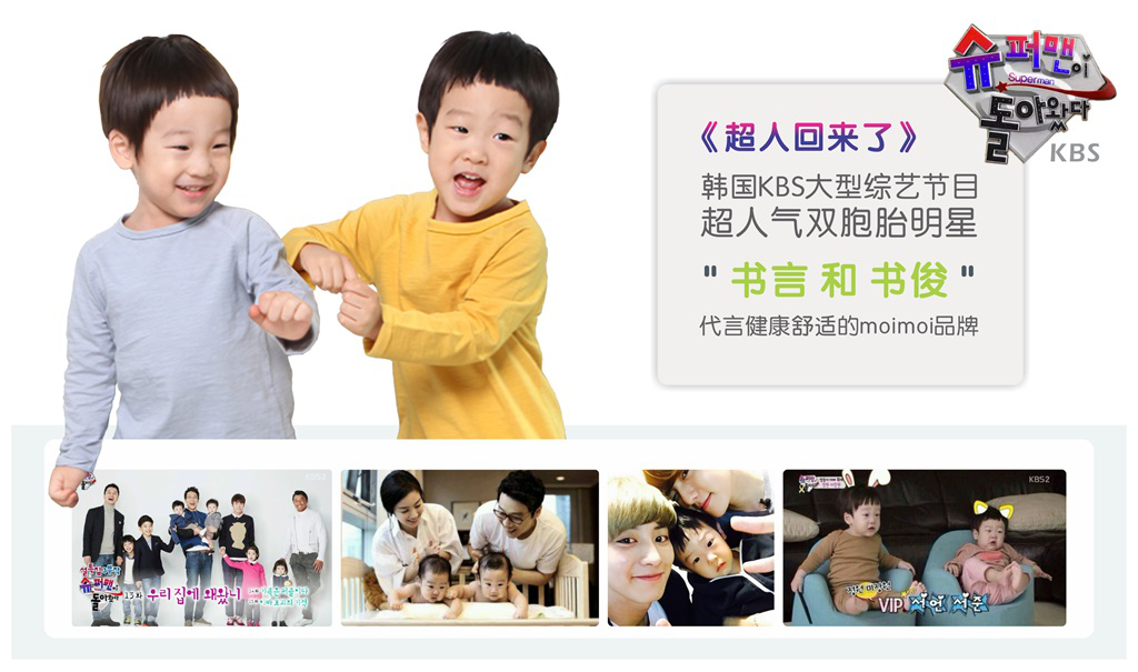 《超人回来了》是韩国KBS电视台的一档亲子娱乐综艺真人秀节目。该节目的制作公司为韩国的(株)KOEN MEDIA公司,是韩国规模最大的制作公司。其节目影响力在整个亚洲地区非同凡响,在韩国综艺节目收视率连续34周稳居冠军宝座。书言和书俊是节目中最具人气的双胞胎明星。之前moimoi在节目中多次赞助其服装,从2016年2月开始,书言和书俊代言健康舒适的moimoi品牌。本次代言活动必将极大提升moimoi在亚洲市场的知名度,也会有力促进moimoi在各个市场的销售业绩。